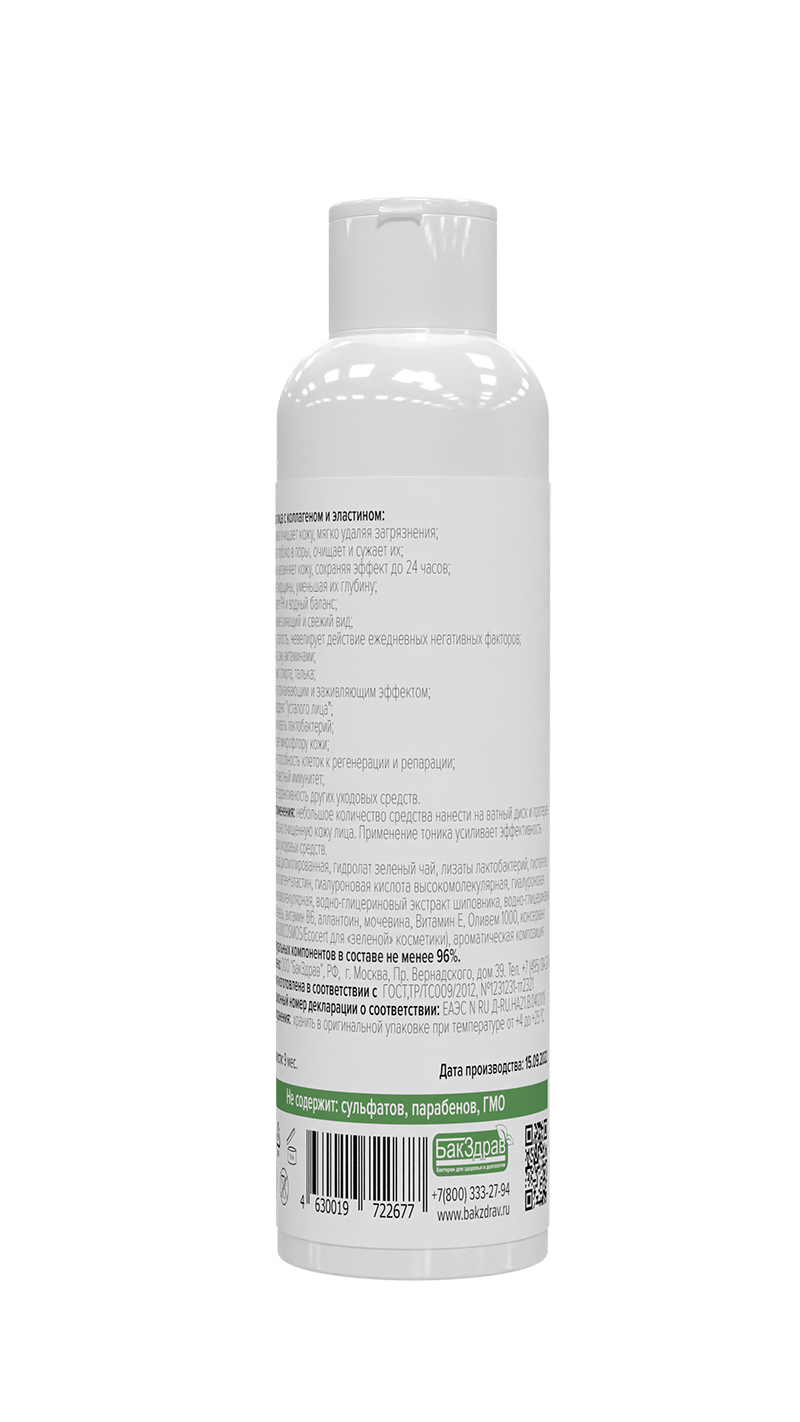 Вода дистиллированная, гидролат зеленого чая, лизаты лактобактерий, гиспагель, комплекс коллаген+эластин, гиалуроновая кислота высокомолекулярная, гиалуроновая кислота низкомолекулярная, водно-глицериновый экстракт шиповника, водно-глицериновый экстракт березы, витамин В6, аллантоин, мочевина, Витамин Е, Оливем 1000, консервант SensicareM3300 (COSMOS/Ecocert для «зеленой» косметики), ароматическая композиция.