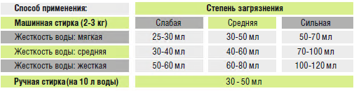 Ручная стирка: 30-50 мл геля на 10 л воды.