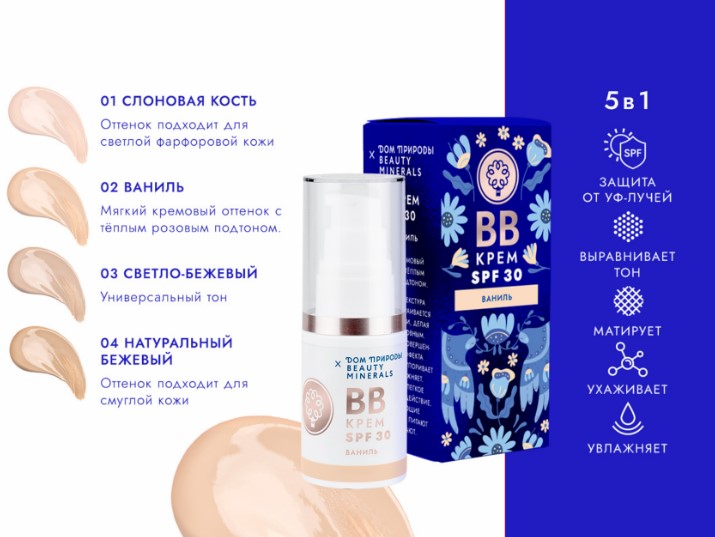 Легкий ВВ-крем быстро впитывается, создает равномерный тон. Сохраняет кожу увлажненной в течение дня и скрывает ее недостатки. Физический фильтр защищает от УФ-лучей. Сквалан и гиалуроновая кислота улучшают цвет лица и тонус кожи