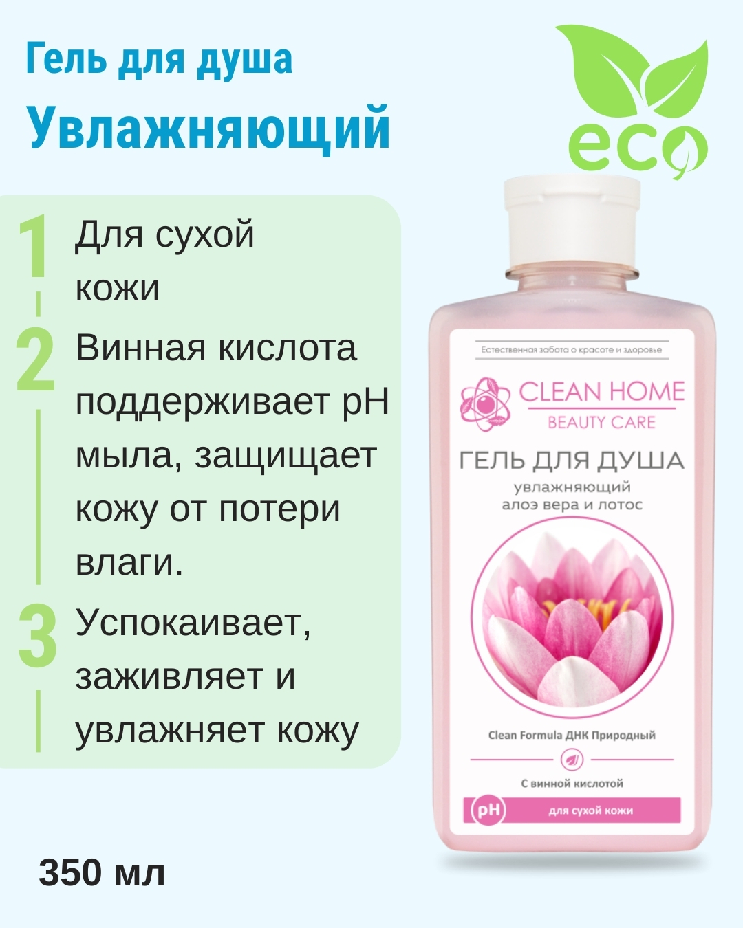 Увлажняющий гель для душа CLEAN HOME BEAUTY CARE с винной кислотой разработан для восстановления пониженного pH и эффективного увлажнения сухой кожи. Винная кислота в составе продукта поддерживает необходимый pH уровень геля, что способствует защите кожи от потери влаги и обеспечивает её мягкость и гладкость. Уникальная Clean Formula ДНК использует действительно необходимые натуральные компоненты для максимального ухода.