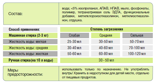 Это средство легко выполаскивается и подходит для всех видов тканей в воде любой жесткости. Оно может использоваться как для ручной, так и для машинной стирки.