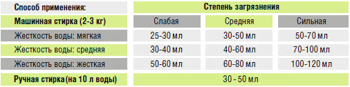 Машинная стирка: в зависимости от жесткости воды (чем больше жесткость, тем больше геля):