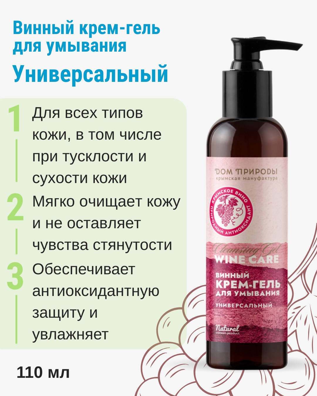 При регулярном применении универсальный винный крем-гель помогает коже оставаться чистой, более гладкой и визуально более ровной по тону. Ощущение стянутости после умывания уменьшается, кожа сохраняет комфорт и лучше воспринимает последующий уход за счет сочетания мягкого очищения и увлажняющих компонентов.