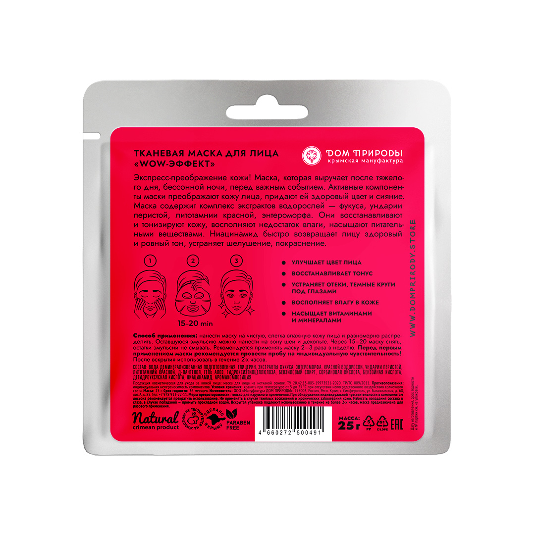Активные компоненты маски преображают кожу лица, придают ей здоровый цвет и сияние. Маска содержит комплекс экстрактов водорослей - фукуса, ундарии перистой, литотамнии красной, энтероморфа. Они восстанавливают и тонизируют кожу, восполняют недостаток влаги, насыщают питательными веществами. Ниацинамид быстро возвращает лицу здоровый и ровный тон, устраняет шелушение, покраснение.
