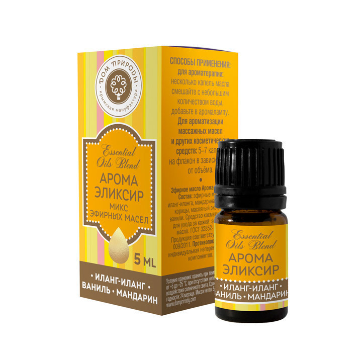 Комплекс эфирных масел "Арома-эликсир" – удивительный аромат гармонии, благополучия и любви. Эфирные масла ванили, иланг-иланга и мандарина создадут романтическое настроение и подарят положительные эмоции.