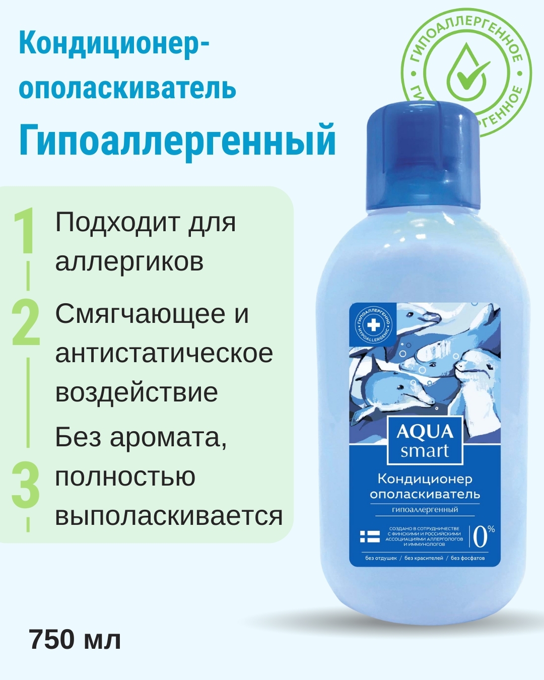 Концентрированный кондиционер ополаскиватель для стирки белья AQUASMART - это инновационное гипоаллергенное средство, разработанное с учетом рекомендаций Ассоциаций иммунологов и аллергологов из Финляндии и России для людей с чувствительной кожей, аллергиков, детей, беременных женщин и всех тех, кто заботится о своем здоровье и здоровье своих близких.