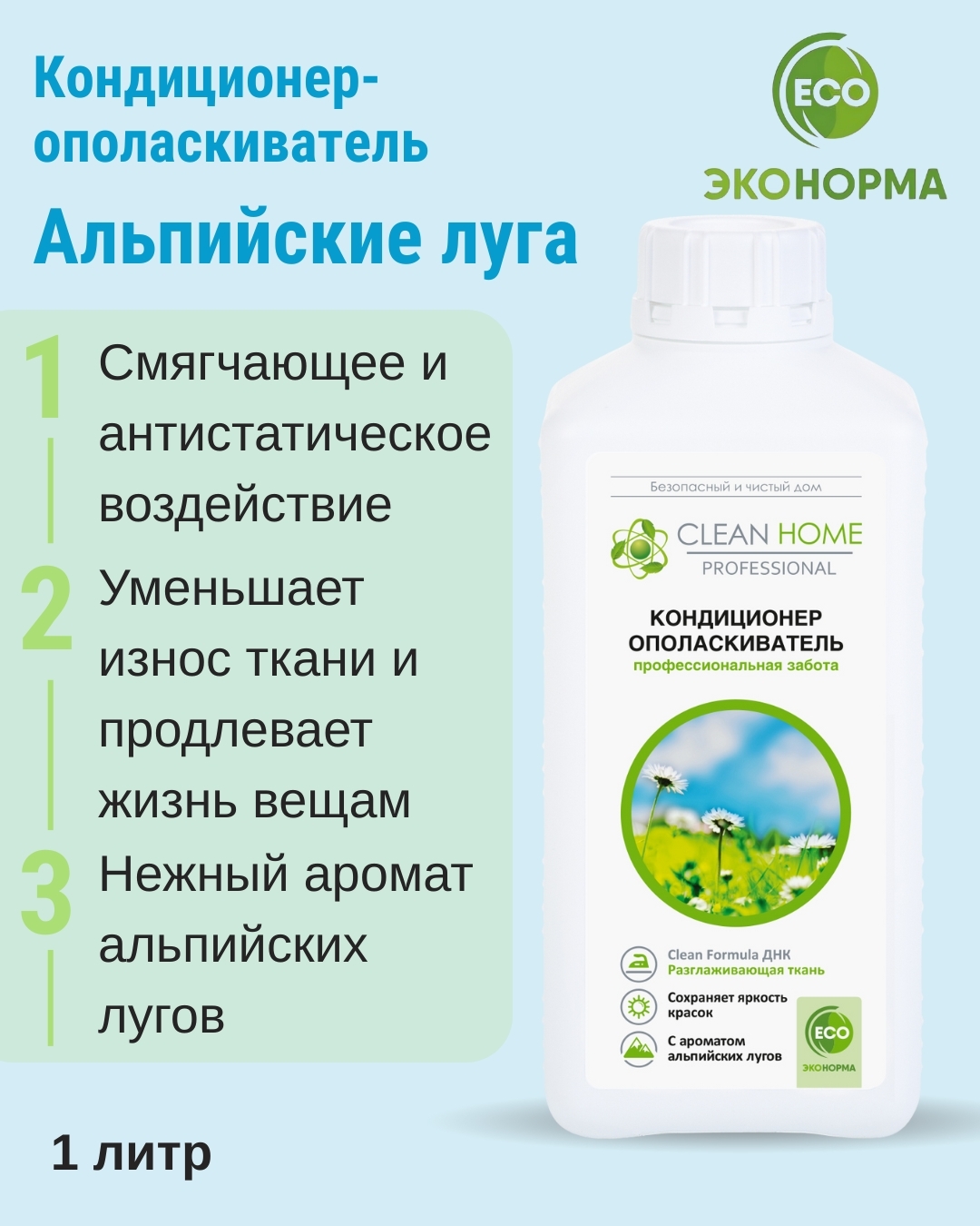 CLEAN HOME Кондиционер-ополаскиватель для белья с ароматом альпийских лугов - это средство, разработанное специально для ухода за бельем из хлопка, шерсти и синтетических материалов.