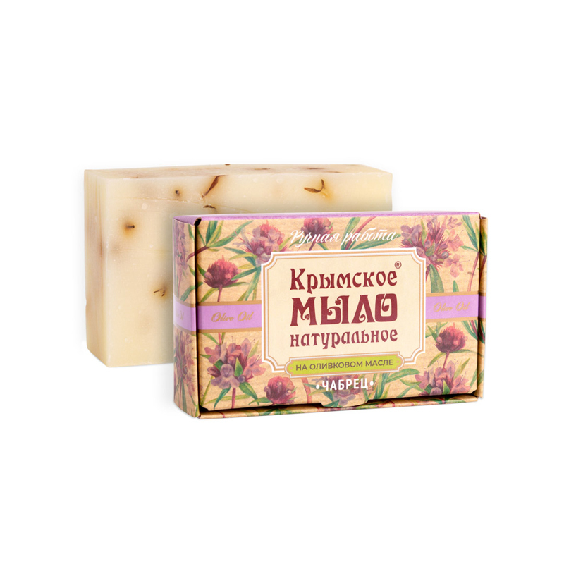 омыленные растительные масла (оливковое, кокосовое, касторовое), вода подготовленная, масло виноградных косточек, масло какао, отвар чабреца, эфирное масло чабреца, цветки чабреца.