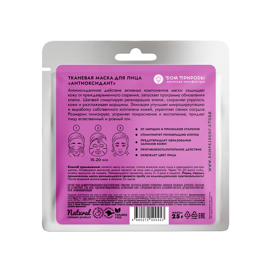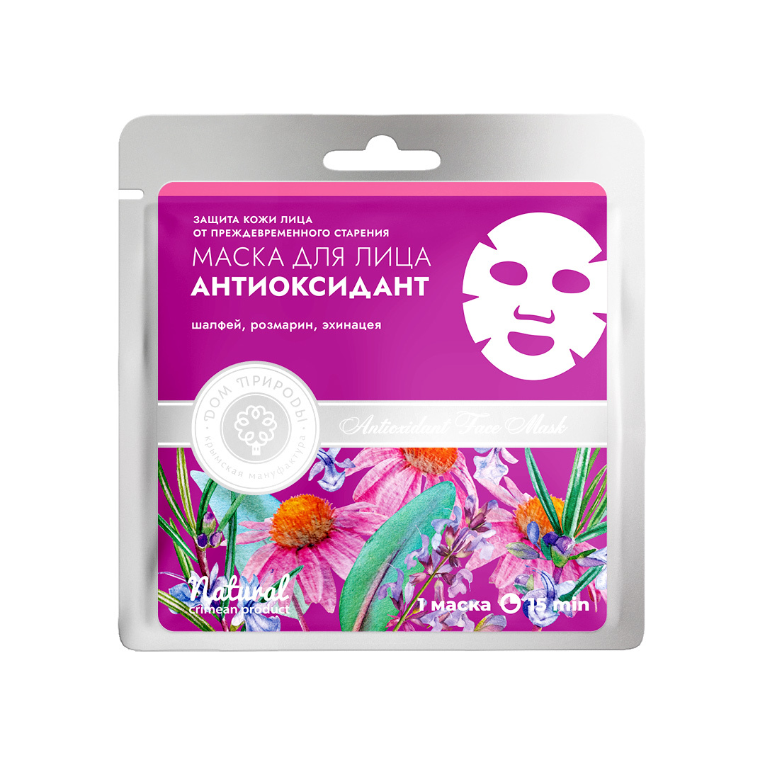 Антиоксидантное действие активных компонентов маски защищает кожу от преждевременного старения, запускает программу обновления клеток. Шалфей стимулирует регенерацию клеток, сохраняет упругость кожи и разглаживает морщины. Эхинацея улучшает микроциркуляцию и выработку собственного коллагена кожей, укрепляет стенки сосудов. Розмарин тонизирует, устраняет покраснение и воспаление, придает лицу естественный и ровный тон.