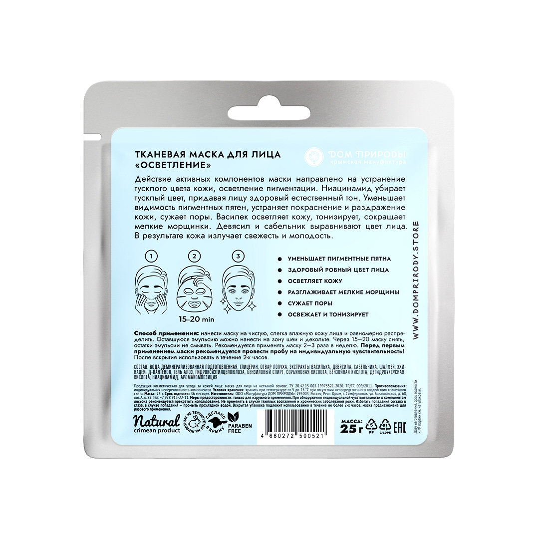 Действие активных компонентов маски направлено на устранение тусклого цвета кожи, осветление пигментации.