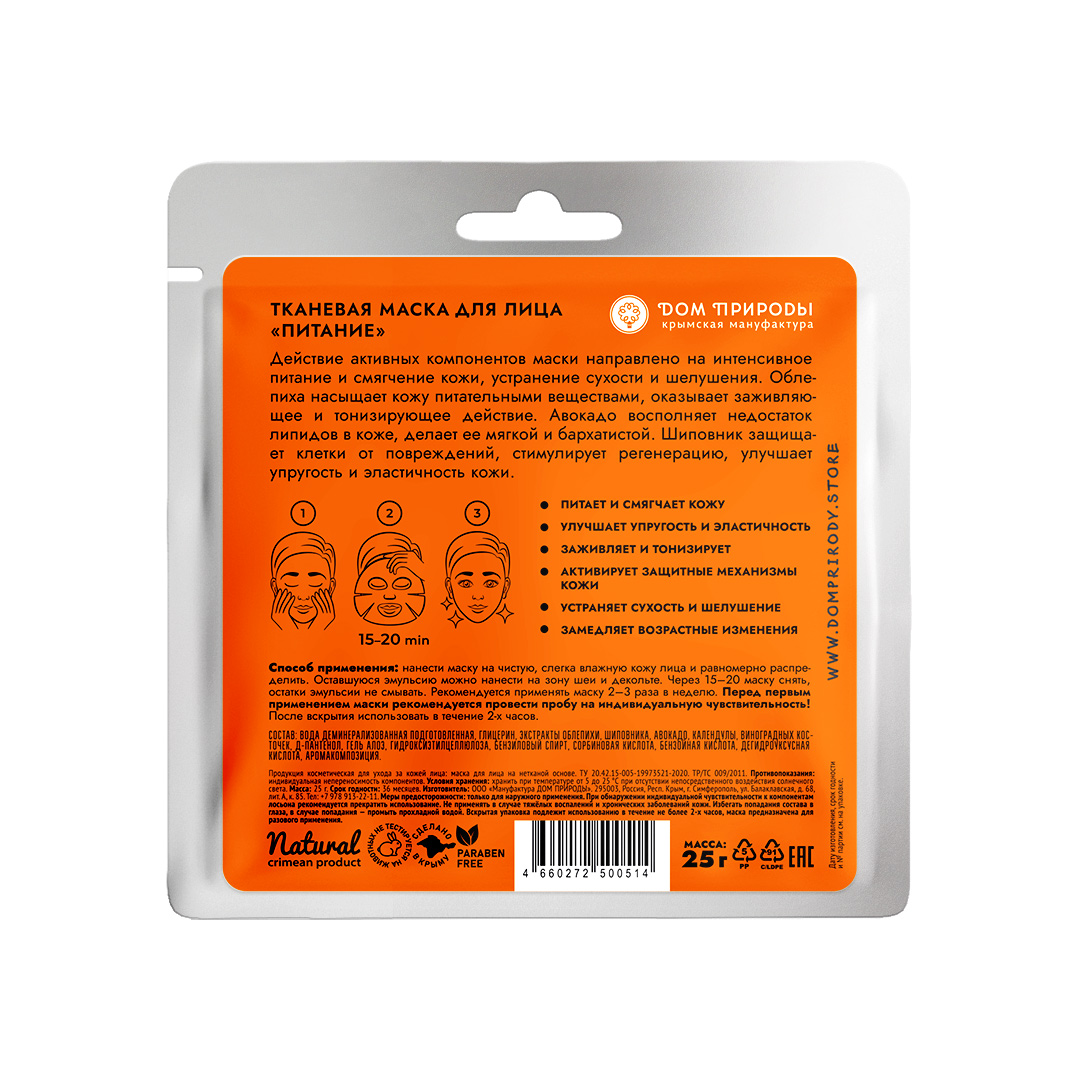 Действие активных компонентов маски направлено на интенсивное питание и смягчение кожи, устранение сухости и шелушения. Облепиха насыщает кожу питательными веществами, оказывает заживляющее и тонизирующее действие. Авокадо восполняет недостаток липидов в коже, делает ее мягкой и бархатистой. Шиповник защищает клетки от повреждений, стимулирует регенерацию, улучшает упругость и эластичность кожи.