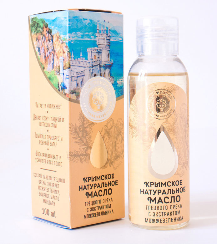 Масло грецкого ореха содержит рекордное количество витамина Е и жирных кислот Омега-3 и Омега-6 (до 77%). Оно быстро впитывается в кожу, придавая ей шелковистость, подтягивает и делает ее гладкой и упругой; укрепляет волосы и помогает продлить «жизнь» загару. Это питательное масло обогащено экстрактом можжевельника и эфирным маслом миндаля, которые усиливают его тонизирующие и омолаживающие свойства.