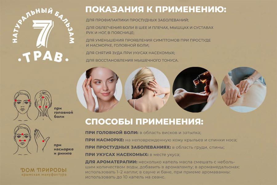 небольшое количество бальзма нанести на отдельные участки и втереть в кожу: при головной боли – в область висков и затылка; при насморке – под ноздрями; при простудных заболеваниях – в область груди, спины, живота; при укусах насекомых – в месте укуса.