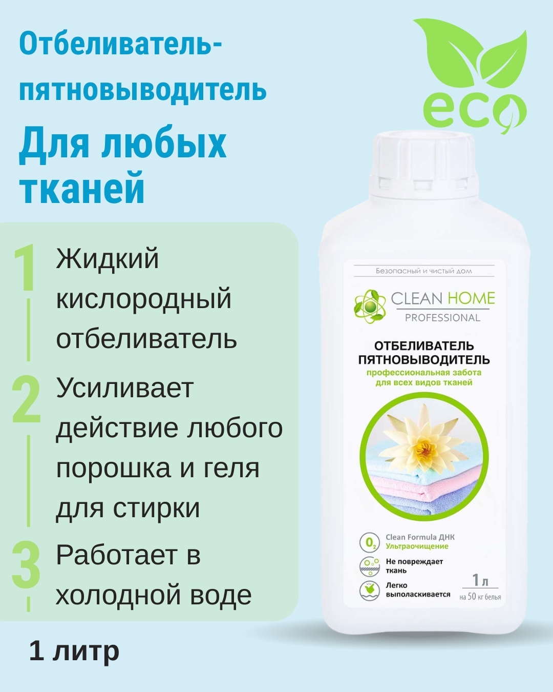 CLEAN HOME Отбеливатель пятновыводитель - это инновационное средство, разработанное специально для ухода за бельем. Оно эффективно удаляет пятна и загрязнения, сохраняя при этом яркость ткани.