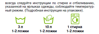 Усилитель стирки: 1–2 ложки (в зависимости от степени загрязнения) в отсек стиральной машины с основным моющим средством или растворить в 10 литрах воды при ручной стирке.