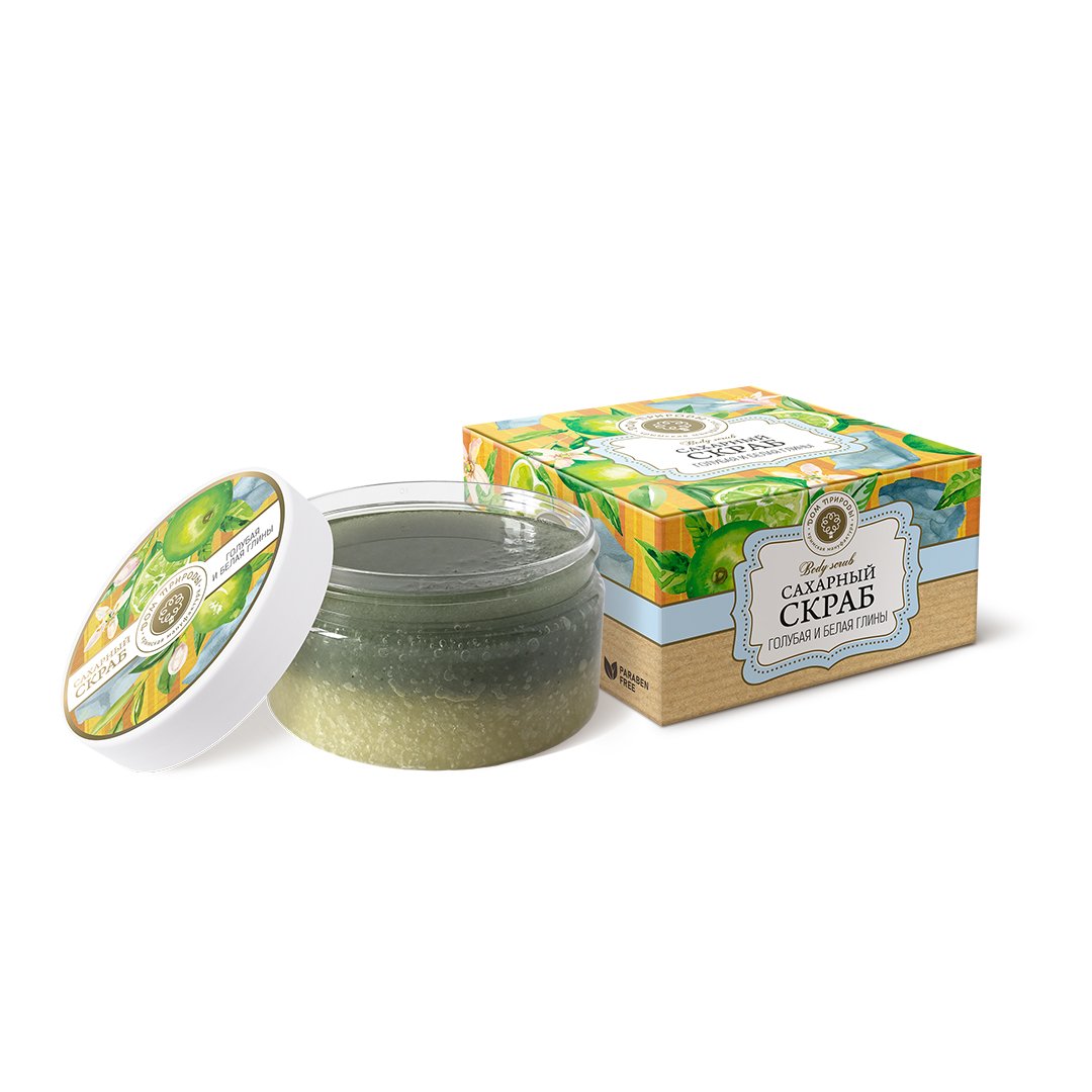 Голубая глина обладает очищающими свойствами, дезинфицирует кожу, активизирует кровообращение и усиливает процесс обмена веществ в клетках. Белая глина (каолин) выравнивает цвет кожи, всесторонне ее оздоравливает, насыщая полезными веществами: кремнием, цинком, калием, натрием. Каолин способствует выработке коллагена, который отвечает за эластичность и упругость кожи. Сахарные кристаллики в сочетании с маслами оливок, репейника и жожоба бережно очищают кожу от загрязнений и отмерших клеток, делают ее мягкой, нежной и шелковистой. После скраба не требуется применение дополнительных средств для увлажнения кожи.