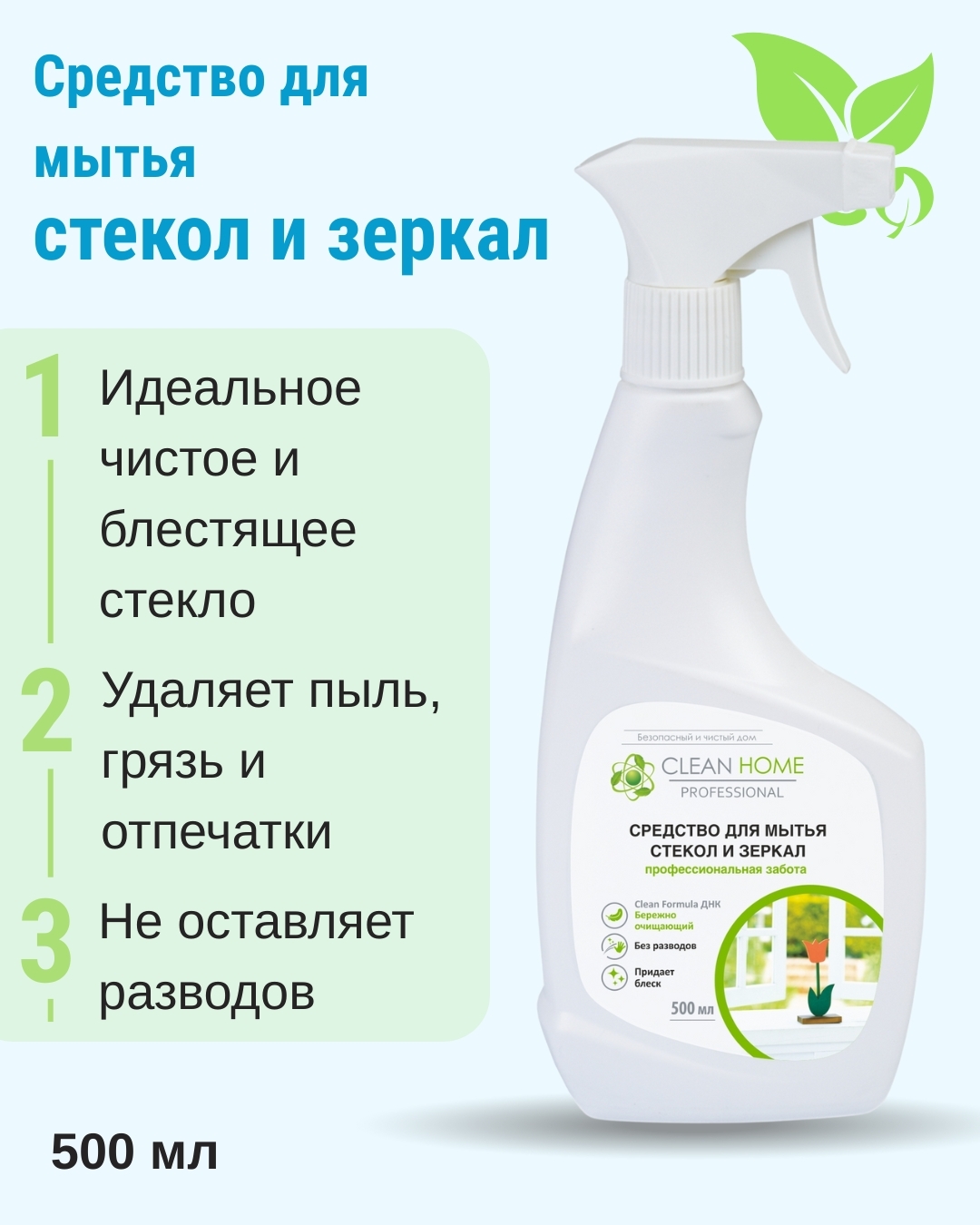 CLEAN HOME Средство для мытья стекол и зеркал - это эффективное средство для очистки стекол, окон, зеркал, декоративных изделий из стекла, фарфора и хрусталя. Оно удаляет пятна, грязь, следы от пальцев и защищает от пыли, придавая блеск. Средство не оставляет разводов и безопасно для человека и природы при использовании по назначению.