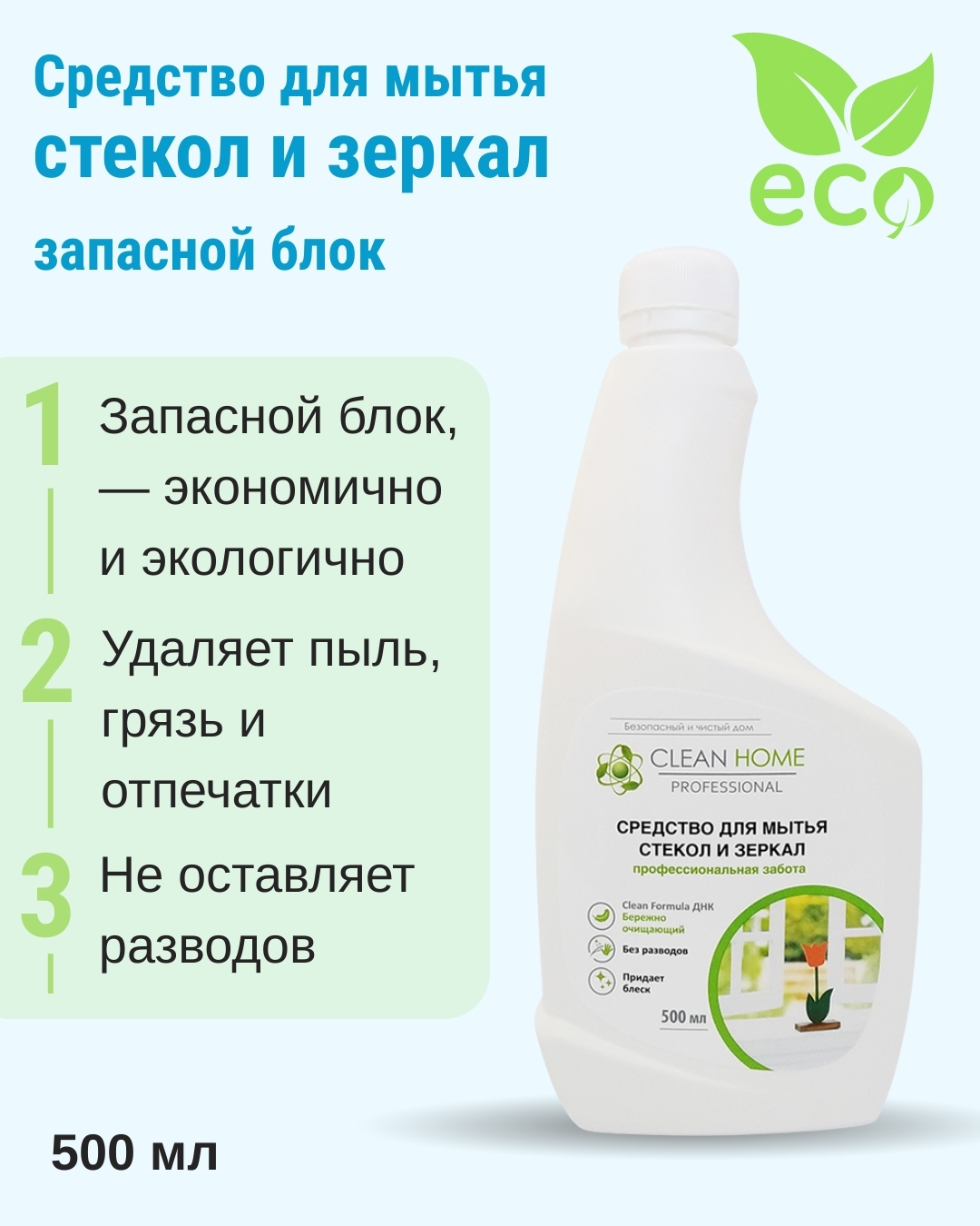 CLEAN HOME Средство для мытья стекол и зеркал - это эффективное средство для очистки стекол, окон, зеркал, декоративных изделий из стекла, фарфора и хрусталя. Оно удаляет пятна, грязь, следы от пальцев и защищает от пыли, придавая блеск. Средство не оставляет разводов и безопасно для человека и природы при использовании по назначению.