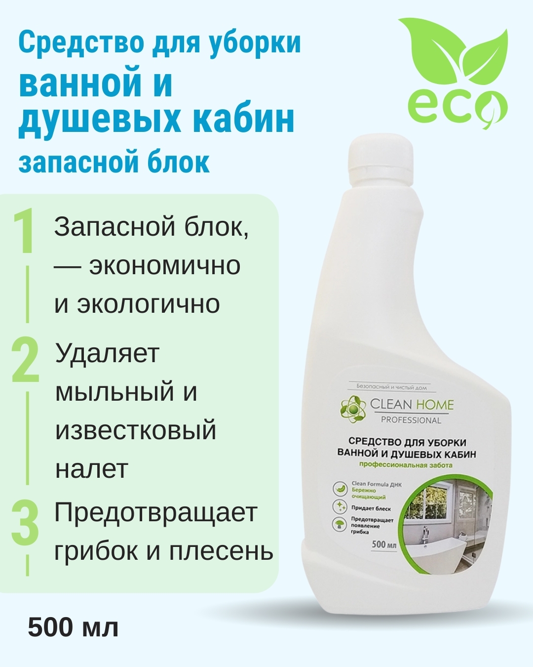 CLEAN HOME Средство для уборки ванной и душевых кабин - это высокоэффективное средство для чистки поверхностей ванн, раковин, кафеля, душевых кабин. Оно подходит для использования на акриловых поверхностях и устраняет следы мыла, солевые отложения, растворяет водные камни и ржавчину, предотвращает появление грибка и плесени на поверхности кафеля. Средство придает дополнительный блеск и безопасно для человека и природы при использовании по назначению.