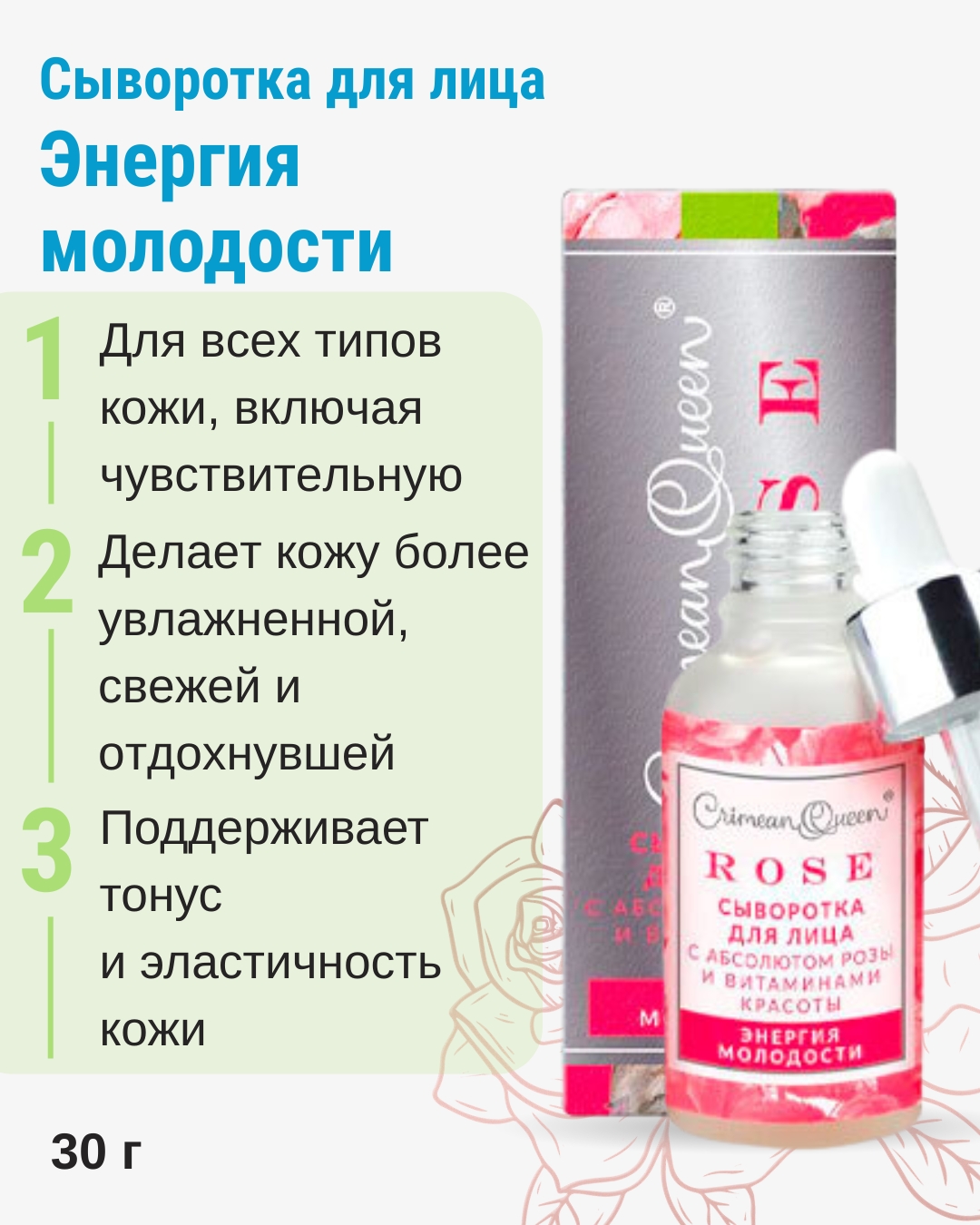 Сыворотка — это легкое концентрированное средство, которое наносят после очищения и до крема, чтобы доставить активные компоненты глубже в кожу и точечно работать с тусклостью, сухостью и неровной текстурой. Сыворотка действует как усилитель ухода: улучшает уровень увлажнения, поддерживает тонус и помогает визуально освежить кожу. Такой формат удобен в ежедневной рутине утром и вечером, когда нужно дополнительное питание и мягкая поддержка без плотной текстуры.