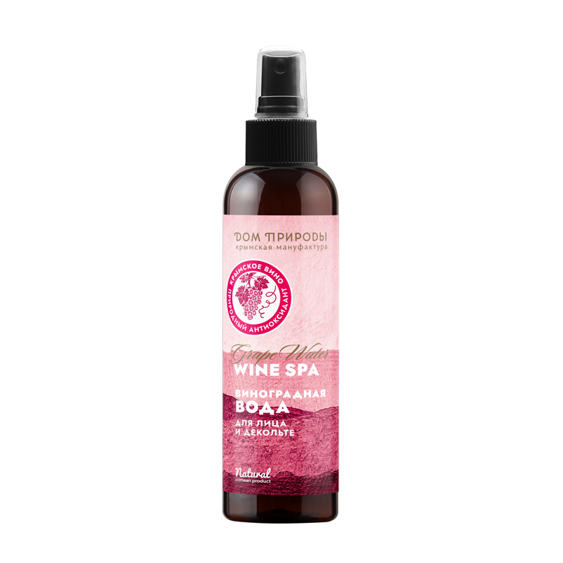 Виноградная вода борется со свободными радикалами, которые являются причиной старения кожи. Средство обладает тонким винно-фруктовым ароматом, увлажняет и освежает кожу. Красное вино, полифенолы винограда и гиалуроновая кислота оказывают антиоксидантное действие, заботятся о сохранении молодости и упругости кожи лица и зоны декольте. Можно использовать в течение дня для поддержания оптимального уровня влаги в коже.